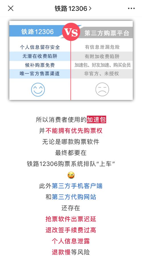 鐵路12306發(fā)布官方聲明稱,消費者使用加速包不能擁有優(yōu)先購票權(quán)。“加速包”非鐵路 12306 網(wǎng)站官方功能,不能保證給用戶提供車票,任何購票APP都要在鐵路 12306 購票系統(tǒng)排隊出票。