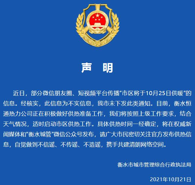 10月21日,衡水市城市管理綜合行政執(zhí)法局發(fā)布聲明,將按照上級(jí)要求和天氣情況,適時(shí)啟動(dòng)市區(qū)供熱工作。供熱時(shí)間將通過(guò)權(quán)威媒體和官方渠道適時(shí)發(fā)布。