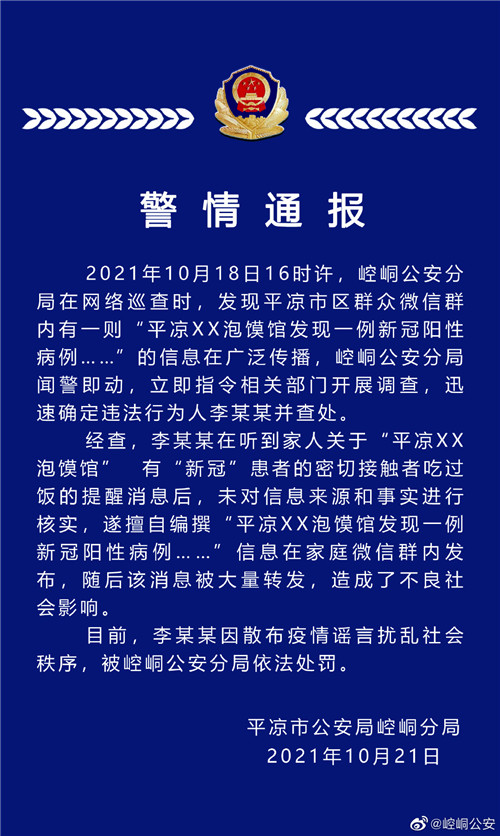 據(jù)悉,違法行為人李某某在聽到家人談論“有新冠患者的密切接觸者到平?jīng)瞿撑蒺x館吃過飯”后,未對其來源和事實進行核實,擅自編撰上述消息,并在社交媒體上傳播。