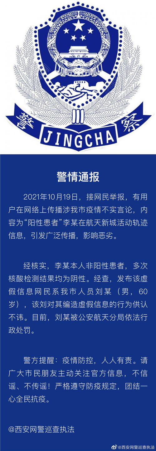 經(jīng)警方調(diào)查,該信息系西安市民劉某(男,60歲)虛假編造,目前劉某已被公安航天分局依法行政處罰。