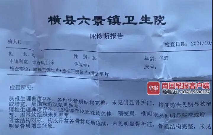 記者拿到了該女子在六景鎮(zhèn)衛(wèi)生院的診斷報(bào)告,檢查部位為“胸椎正側(cè)位片+腰椎正側(cè)位片+骨盆平片”,未見(jiàn)明顯骨折,骨質(zhì)結(jié)構(gòu)完整。