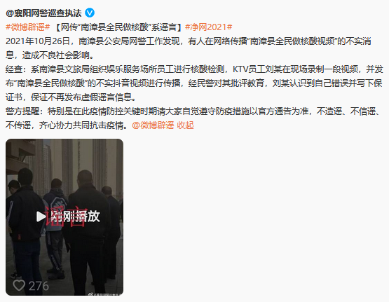 該視頻內(nèi)容系湖北省襄陽市南漳縣文旅局組織娛樂服務場所員工進行核酸檢測,一KTV員工劉某于現(xiàn)場錄制視頻后,發(fā)布“南漳縣全民做核酸”的虛假信息。
