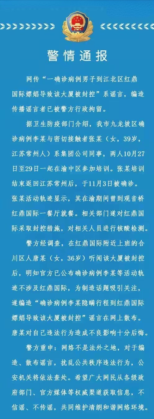 近日,網傳“一確診病例男子到重慶江北區(qū)某大廈嫖娼,導致該大廈被封控”。經警方查證,此為謠言!
