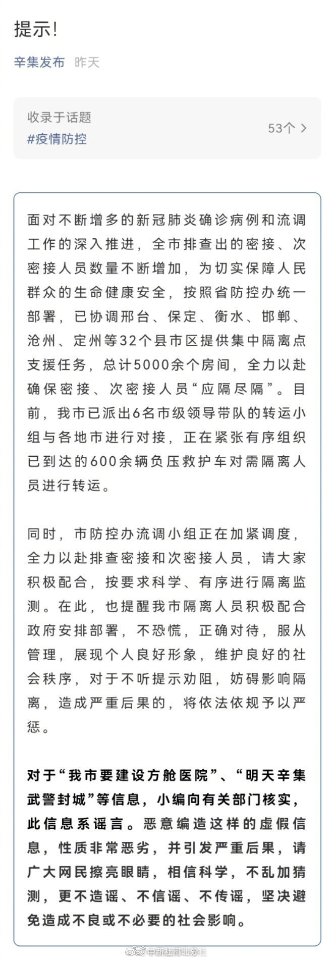 近日,網(wǎng)傳“河北辛集市要建設(shè)方艙醫(yī)院” “明天辛集武警封城”。經(jīng)有關(guān)部門核實(shí),以上信息系謠言。
