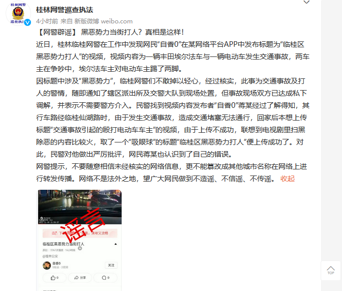 因標題中涉及“黑惡勢力”,臨桂網(wǎng)警們不敢掉以輕心,經(jīng)過核實,此事為交通事故及打人的警情,隨即通知了轄區(qū)派出所及交警大隊到現(xiàn)場處置,但事故現(xiàn)場雙方已達成私下調(diào)解,并表示不需要警方介入。民警找到視頻內(nèi)容發(fā)布者“自香0”蔣某經(jīng)過了解得知,其行車路經(jīng)臨桂仙湖路時,由于發(fā)生交通事故,造成交通堵塞無法通行,回家后本想上傳標題“交通事故引起的毆打電動車車主”的視頻,由于上傳不成功,聯(lián)想到電視劇里掃黑除惡的內(nèi)容比較火,取了一個“吸眼球”的標題“臨桂區(qū)黑惡勢力打人”便上傳成功了。對此,民警對他做出嚴厲批評,網(wǎng)民蔣某也認識到了自己的錯誤。