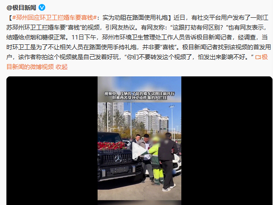 邳州市環(huán)境衛(wèi)生管理處工作人員于11日回應(yīng)表示,對方在路面使用手持禮炮,環(huán)衛(wèi)工人的本意是勸阻該行為,以免對環(huán)境衛(wèi)生造成壓力,并非要“喜錢”。