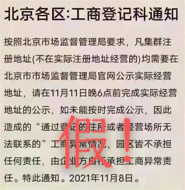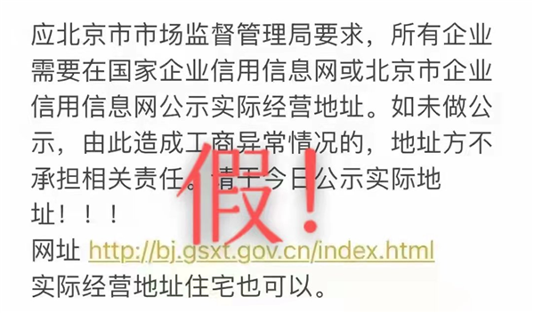 近日,北京部分市場主體收到短信稱“商戶營業(yè)執(zhí)照狀態(tài)顯示異常,法人信息過期”“北京市市場監(jiān)督管理局要求公示實際經營地址,更新信息”“延時不更新要受到處罰”。北京市市場監(jiān)督管理局提醒,以上為虛假信息!官方從未以短信或者圖片形式發(fā)送此類提醒信息!