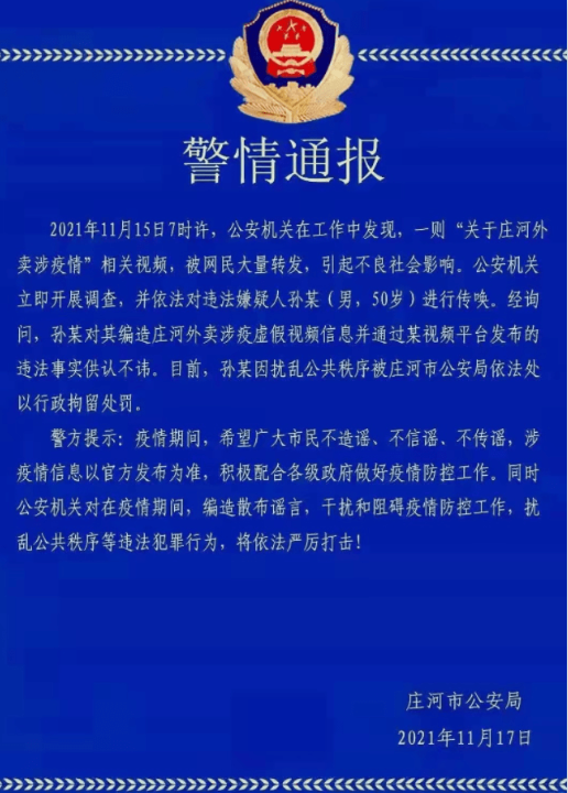 莊河市公安局于17日發(fā)布通報(bào),該虛假信息系孫某發(fā)布。經(jīng)傳喚詢問,孫某對其編造莊河外賣涉疫的虛假視頻信息,并通過社交平臺發(fā)布的違法事實(shí)供認(rèn)不諱。