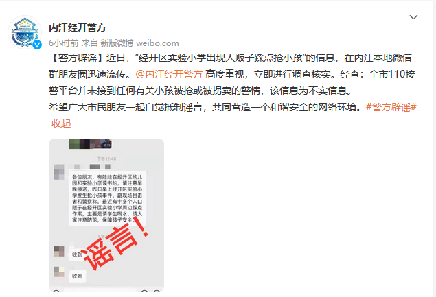 近日,“經開區(qū)實驗小學出現人販子踩點搶小孩”的信息,在內江本地微信群朋友圈迅速流傳。內江經開警方高度重視,立即進行調查核實。經查:全市110接警平臺并未接到任何有關小孩被搶或被拐賣的警情,該信息為不實信息。