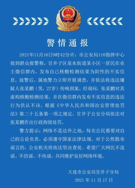 甘井子公安分局于17日發(fā)布通報(bào),造謠者系張某鵬,經(jīng)傳喚詢問,其對(duì)虛構(gòu)核酸檢測(cè)結(jié)果,并在社交平臺(tái)發(fā)布不實(shí)信息的違法行為供認(rèn)不諱。