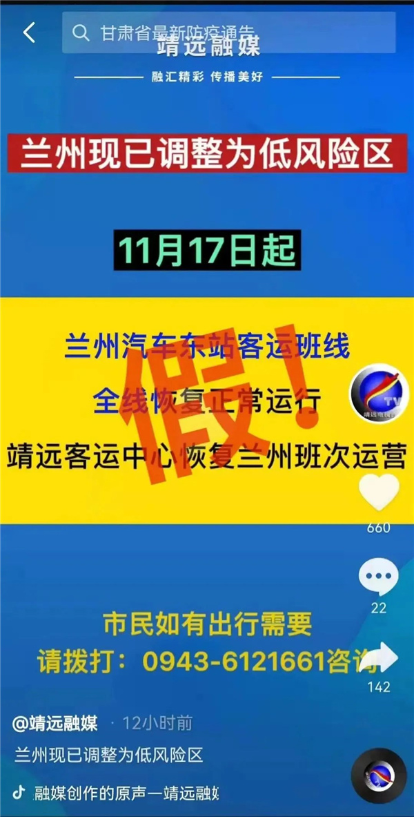 近日,城關(guān)區(qū)新冠肺炎疫情聯(lián)防聯(lián)控領(lǐng)導(dǎo)小組交通檢疫組工作人員發(fā)現(xiàn)“靖遠(yuǎn)融媒”視頻號(hào)在抖音APP發(fā)布“蘭州汽車東站客運(yùn)班線已于今日全線恢復(fù)運(yùn)營(yíng)”的不實(shí)視頻信息,即對(duì)接汽車東站、靖遠(yuǎn)融媒體中心及抖音APP官方客服核查。