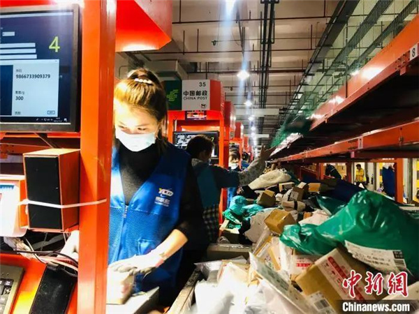 中通員工正在對(duì)快遞進(jìn)行消殺。中通供圖