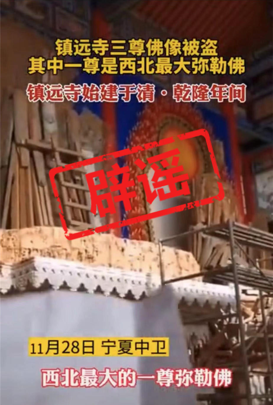 11月30日,有網(wǎng)友爆料稱“寧夏中衛(wèi)市鎮(zhèn)遠(yuǎn)寺三尊佛像被盜”“其中一尊高七八米的佛像系西北最大的一尊彌勒佛”。經(jīng)核實(shí),以上消息不實(shí)。