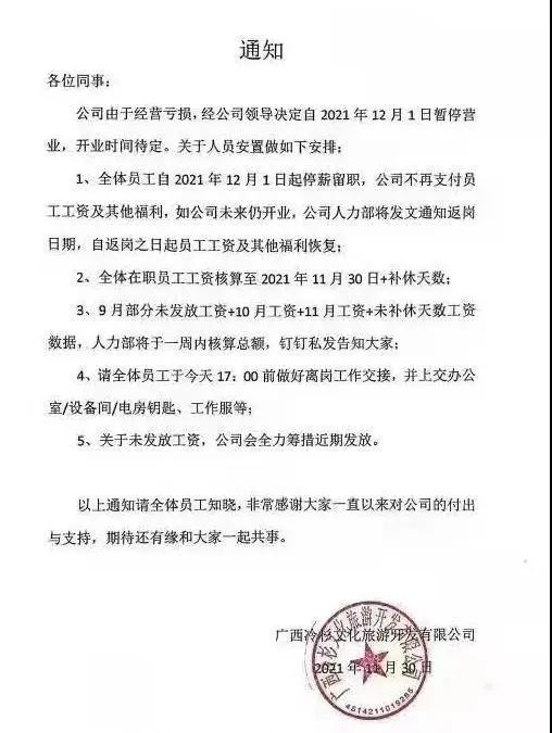 11月30日,廣西冷杉文化有限公司發(fā)布通告稱,由于公司經(jīng)營虧損,決定自2021年12月1日暫停營業(yè),開業(yè)時間待定。該通告一發(fā)布,龍谷灣倒閉的消息也在網(wǎng)上流傳。