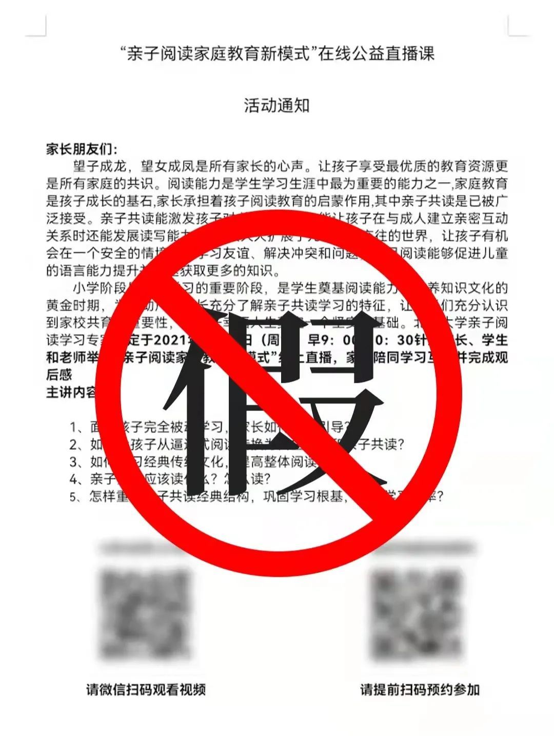 近日,不少成都家長(zhǎng)反映收到一份《關(guān)于舉辦成都讀書月“親子閱讀家庭教育新模式”在線直播活動(dòng)方案》,該方案上蓋有“四川省圖書館”公章并顯示活動(dòng)主辦單位為四川省圖書館,方案內(nèi)容顯示“主辦方將于12月4日上午邀請(qǐng)某專家老師在線授課,講授親子閱讀等相關(guān)內(nèi)容,并邀請(qǐng)各學(xué)生家長(zhǎng)、老師參加”,文末還附相關(guān)二維碼,提醒大家提前掃碼預(yù)約觀看直播,引發(fā)眾多家長(zhǎng)及師生關(guān)注并向四川省圖書館咨詢是否確有其事。