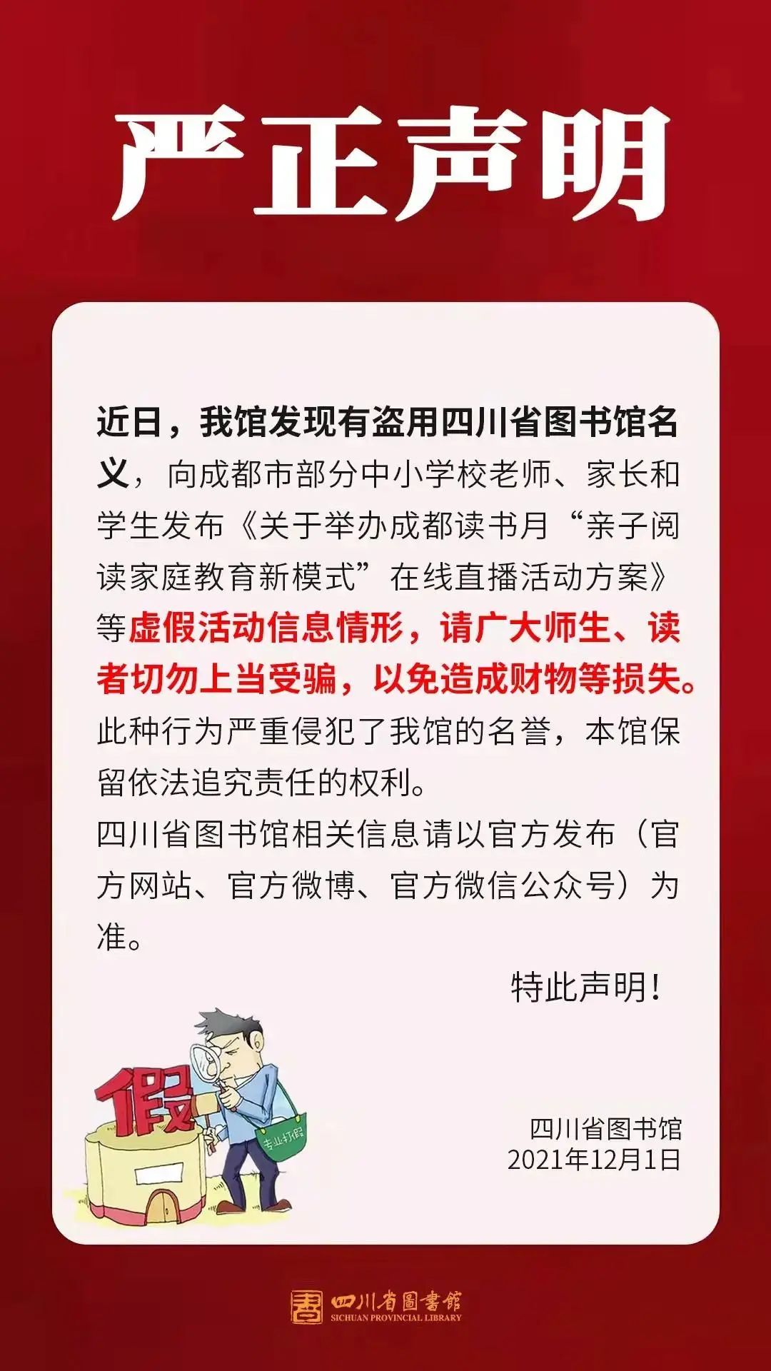針對(duì)網(wǎng)傳信息,四川省圖書館于12月1日通過官方微信公眾號(hào)發(fā)布聲明稱:近日,我館發(fā)現(xiàn)有盜用四川省圖書館名義,向成都市部分中小學(xué)校老師、家長(zhǎng)和學(xué)生發(fā)布《關(guān)于舉辦成都讀書月“親子閱讀家庭教育新模式”在線直播活動(dòng)方案》等虛假活動(dòng)信息情形,請(qǐng)廣大師生、讀者切勿上當(dāng)受騙,以免造成財(cái)物等損失。此種行為嚴(yán)重侵犯了我館的名譽(yù),本館保留依法追究責(zé)任的權(quán)利。