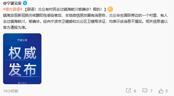 12月6日,寧波市鎮(zhèn)海區(qū)通報3例新冠核酸檢測陽性結(jié)果之后,有人在社交平臺上發(fā)布消息稱“寧波市北侖區(qū)某物業(yè)旁邊的村里,有人去過鎮(zhèn)海區(qū)蛟川,被確診”。
