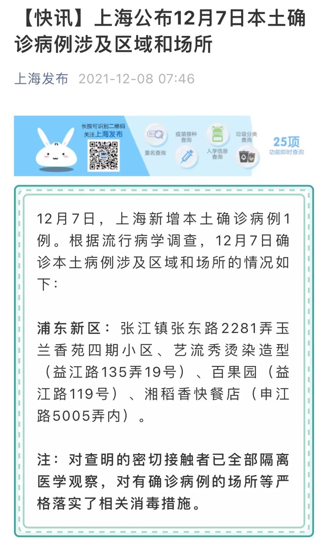 根據(jù)官方通報(bào),此次確診病例居住地在浦東新區(qū)張江鎮(zhèn)。目前,已追蹤到該病例在本市的密切接觸者41人,均已落實(shí)集中隔離觀察。對(duì)病例曾活動(dòng)過的場(chǎng)所已進(jìn)行終末消毒。