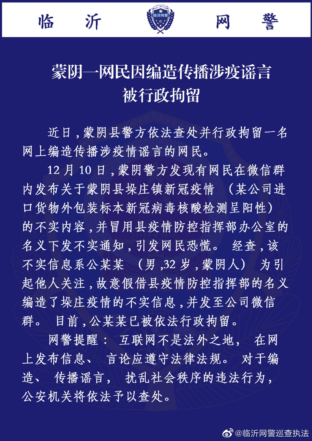 近日,有人在社交平臺(tái)以疫情防控指揮部的名義,發(fā)布消息稱“山東省蒙陰縣垛莊鎮(zhèn),某公司進(jìn)口貨物外包裝標(biāo)本新冠病毒核酸檢測(cè)呈陽(yáng)性”“涉及垛莊鎮(zhèn)的工作人員一律禁止上班”。經(jīng)核實(shí),以上消息不實(shí)!