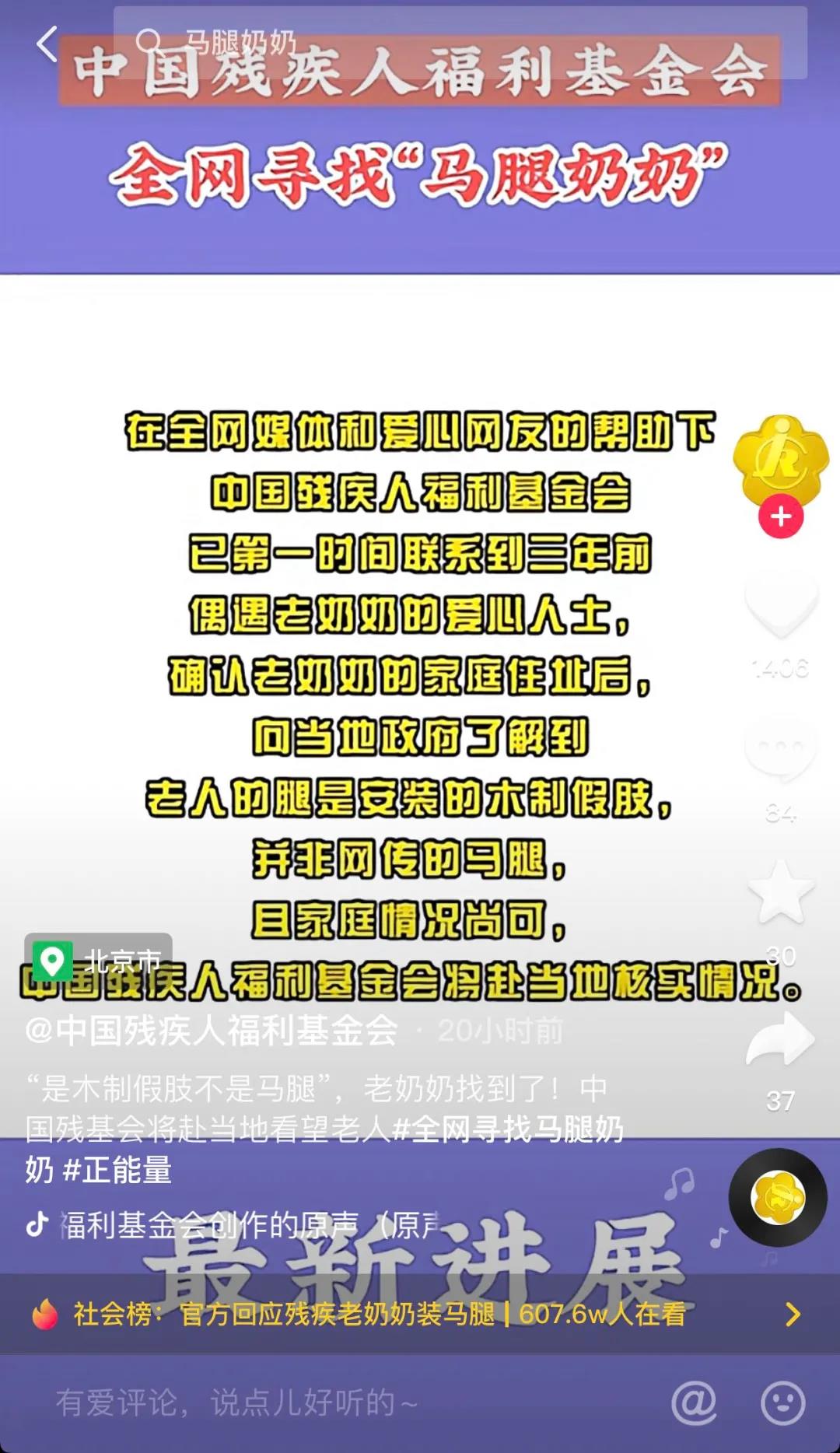 12月14日,中國殘疾人福利基金會的賬號發(fā)布視頻,全網(wǎng)尋找“馬腿奶奶”,懇請網(wǎng)友轉(zhuǎn)發(fā)視頻并提供信息,基金會將第一時間給予救助。