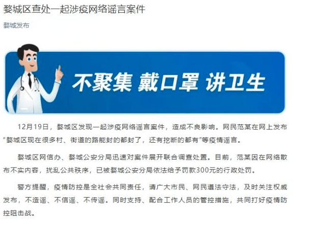 12月19日,浙江金華婺城區(qū)發(fā)現(xiàn)一起涉疫網(wǎng)絡謠言案件,造成不良影響。網(wǎng)民范某在網(wǎng)上發(fā)布“婺城區(qū)現(xiàn)在很多村、街道的路能封的都封了,還有挖斷的都有”等疫情謠言。