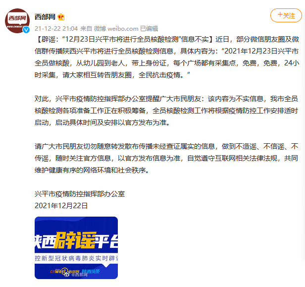 對(duì)此,興平市疫情防控指揮部辦公室提醒廣大市民朋友:該內(nèi)容為不實(shí)信息,我市全員核酸檢測各項(xiàng)準(zhǔn)備工作正在積極籌備,全員核酸檢測工作將根據(jù)疫情防控工作安排適時(shí)啟動(dòng),啟動(dòng)具體時(shí)間及安排以官方發(fā)布為準(zhǔn)。