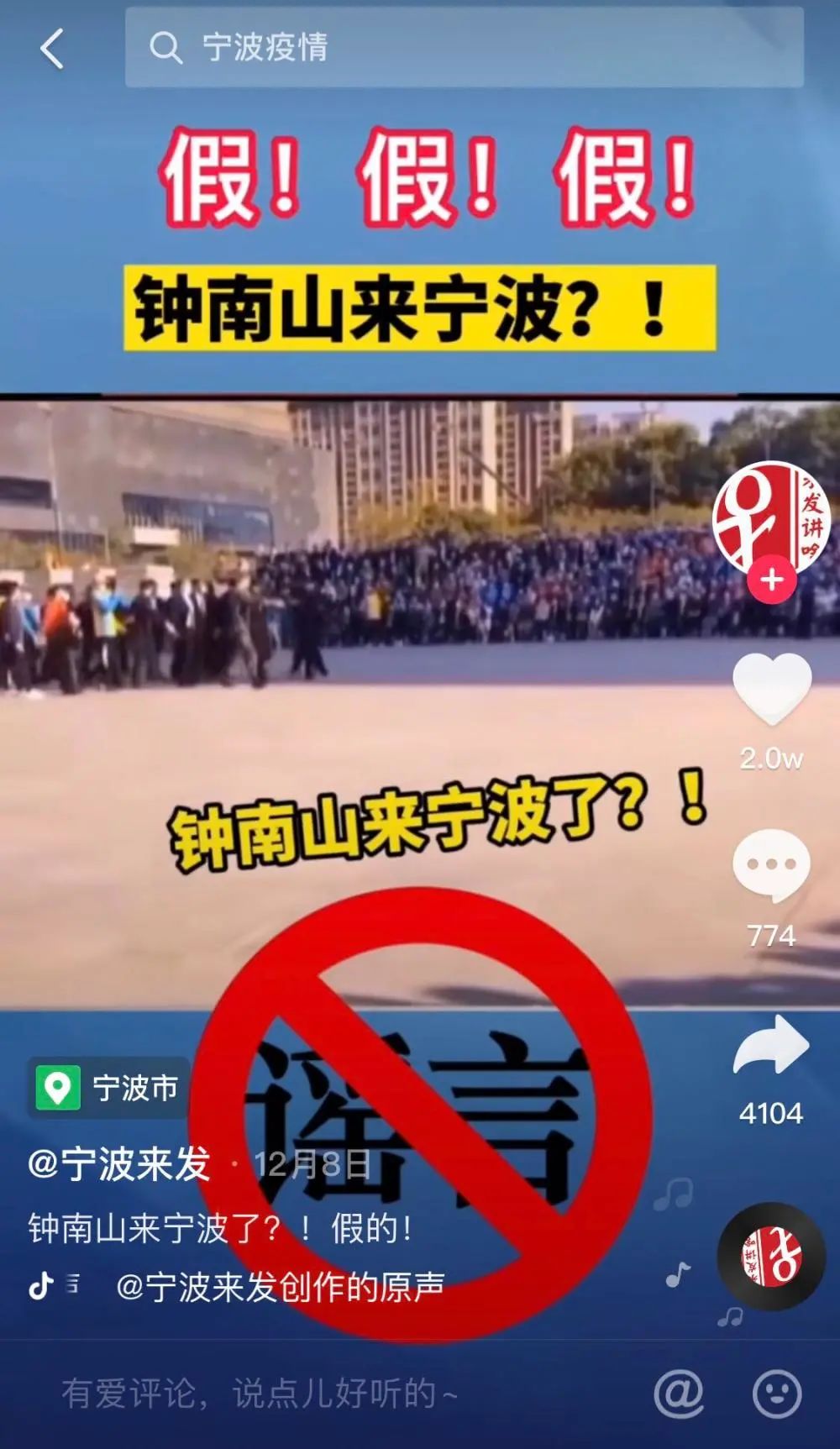 12月8日,“杭州交通918”“寧波來發(fā)”等浙江本地媒體紛紛辟謠“鐘南山來寧波”。