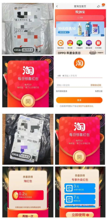 店鋪、發(fā)貨地址、承運(yùn)快遞公司均不同的快遞單,“領(lǐng)洗手液”卻“掃”出“愛淘寶”頁面。