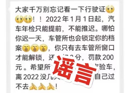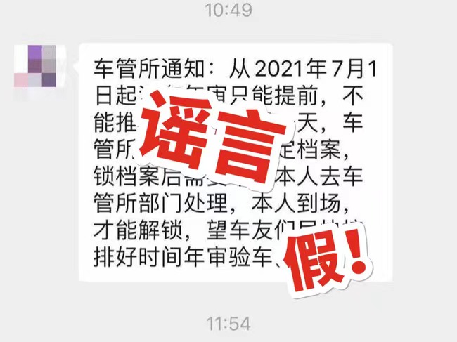 記者搜索“推遲辦年檢,車輛將被鎖定”等相關(guān)信息后發(fā)現(xiàn),這類謠言在網(wǎng)上出現(xiàn)過多次。在今年7月,江蘇南京車管所辟謠稱,目前車管部門沒有相關(guān)政策對逾期未檢車輛的檔案采取強制措施。雖然已有官方辟謠,但是仍有人把謠傳的時間一改,轉(zhuǎn)發(fā)假消息到微信群。