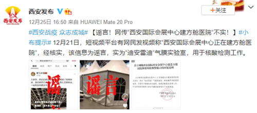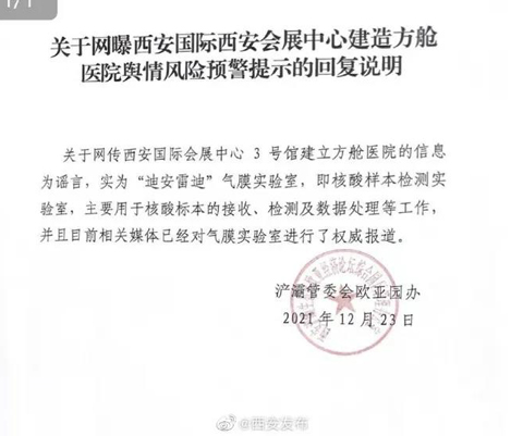 12月21日,短視頻平臺有網(wǎng)民發(fā)視頻稱“西安國際會展中心正在建方艙醫(yī)院”,經(jīng)核實,該信息為謠言,實為“迪安雷迪”氣膜實驗室,用于核酸檢測工作。 ???