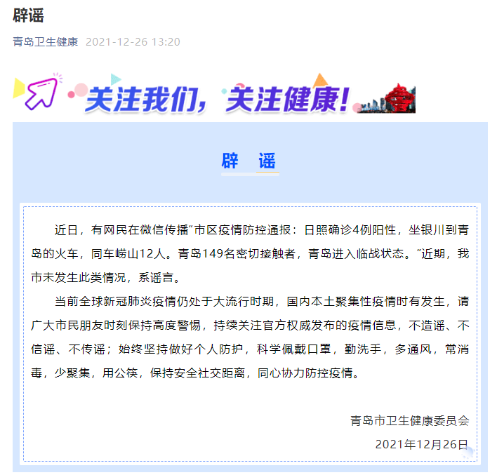 青島市衛(wèi)生健康委員會于12月26日發(fā)布辟謠聲明:近期,青島市未發(fā)生此類情況,網(wǎng)傳消息系謠言!