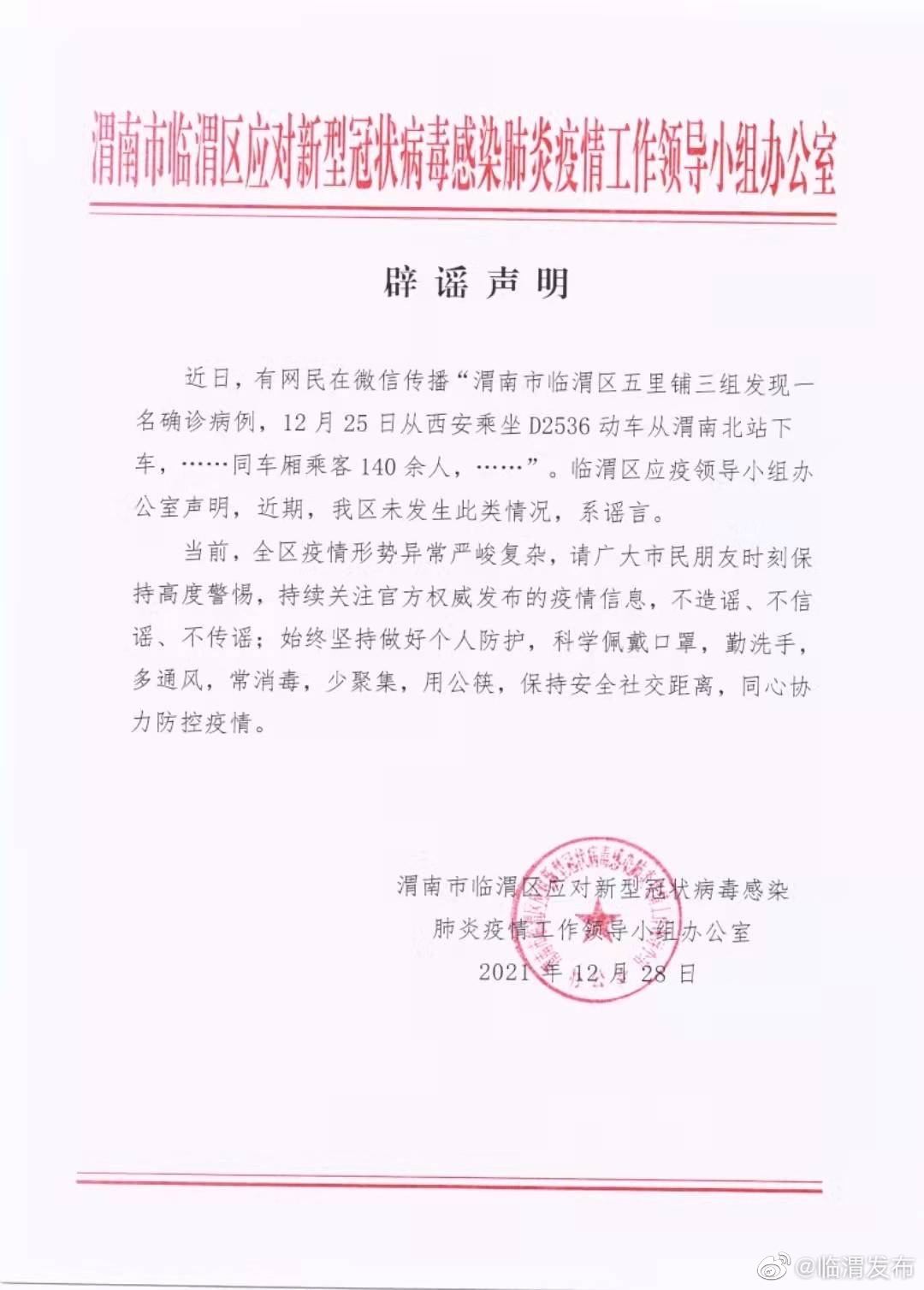 近日,網(wǎng)傳“渭南市臨渭區(qū)五里鋪三組發(fā)現(xiàn)一名陽(yáng)性確診病例,12月25日從西安乘坐D2536動(dòng)車從渭南北站下車,當(dāng)日在渭南市高鐵北站核酸檢測(cè)陽(yáng)性,已隔離,同車廂乘客140余人,均為密接者同車次其他車廂400余人,該140余人六天注動(dòng)軌跡正在排查,現(xiàn)已知北歐半島酒店、金水灣假日酒店、西二路東方大街等地軌跡出現(xiàn)較多,近期大家務(wù)必做好各項(xiàng)防護(hù),接處警務(wù)必保持安全距離,周知!”,經(jīng)證實(shí),此信息為謠言!不存在“渭南疫情防控中心”微信公眾號(hào)!
