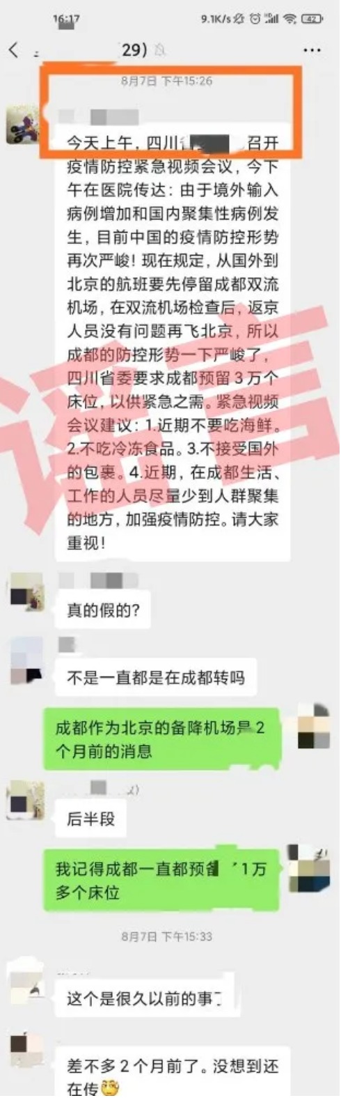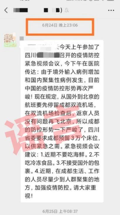 1月3日,一則消息又在網(wǎng)上流傳。這則消息稱,由于境外輸入病例增加和國內(nèi)聚集性防控形勢再次嚴(yán)峻,從國外到北京的航班要先停留成都雙流機場再飛北京;四川要求成都緊急預(yù)留3萬個床位的消息……到底是真是偽?一查詢,是2020年的謠言。