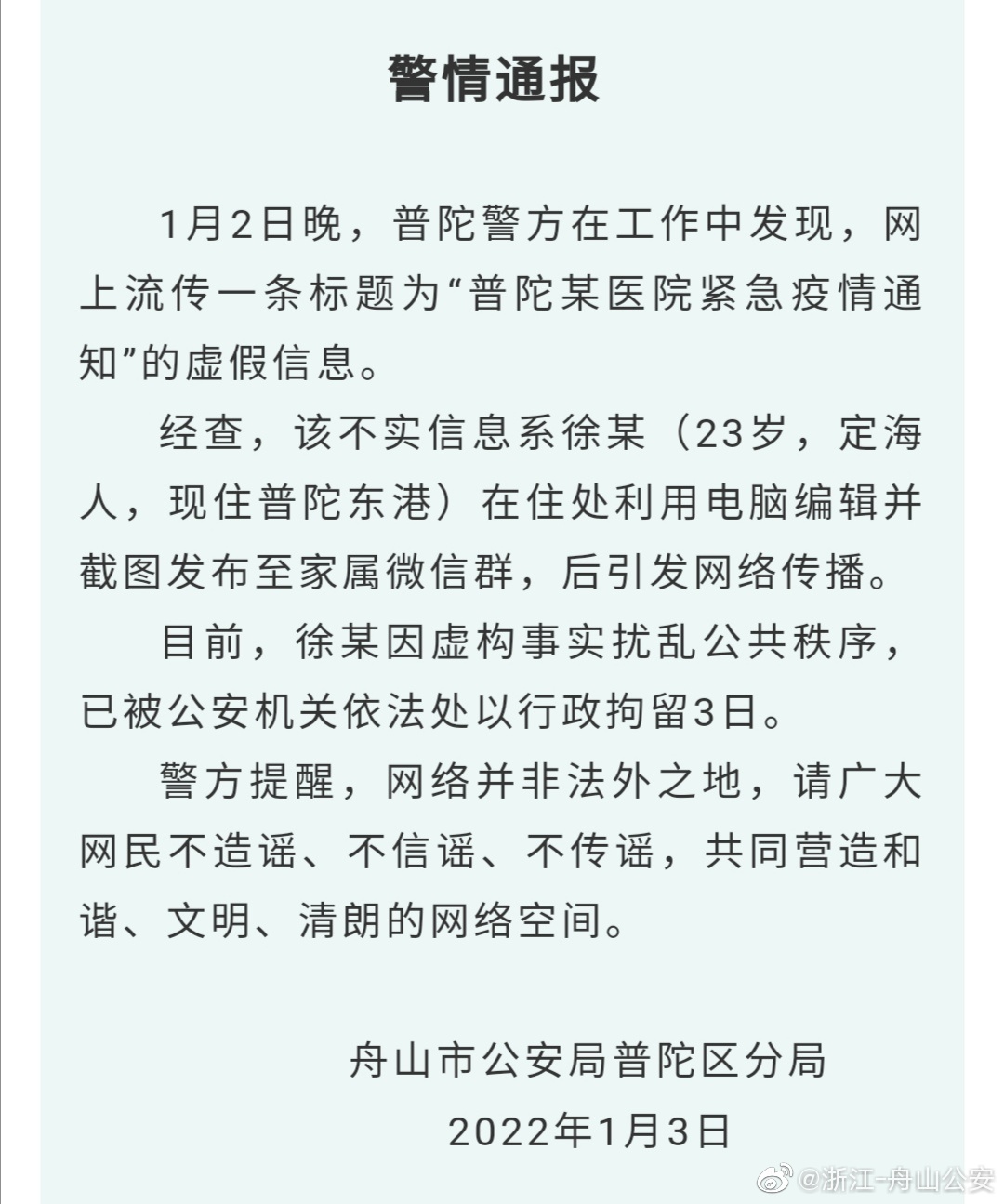 經查,該不實信息系徐某(23歲,定海人,現住普陀東港)在住處利用電腦編輯并截圖發(fā)布至家屬微信群,后引發(fā)網絡傳播。