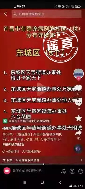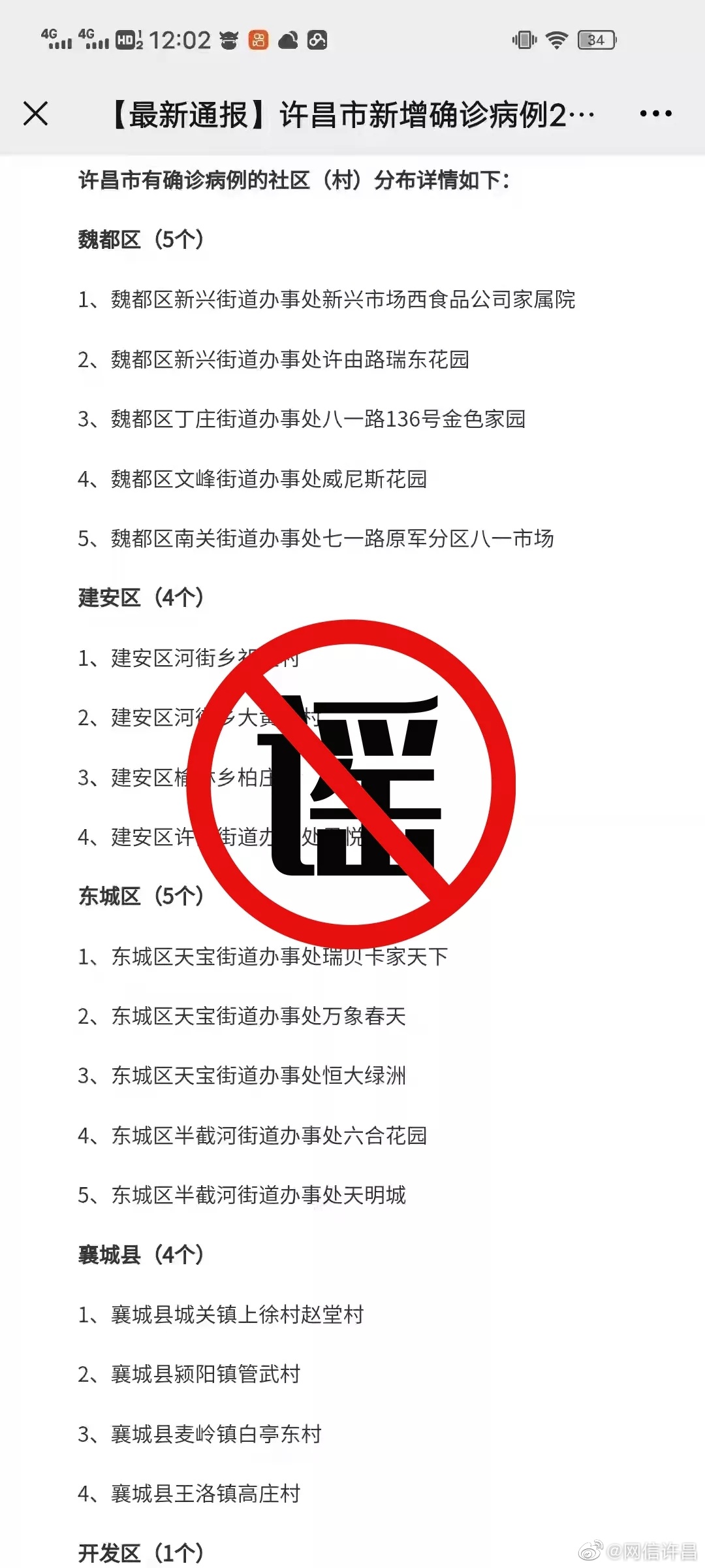 1月6日,中共許昌市委網(wǎng)信辦,通過官方渠道發(fā)布通報:網(wǎng)傳圖片內容均為2020年期間的疫情通報,“許昌市有確診病例的社區(qū)(村)分布詳情”的圖片,實際為建安融媒曾于2020年2月8日報道的當日疫情動態(tài)。