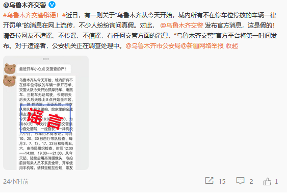 1月6日,烏魯木齊交警通過(guò)官方渠道發(fā)布聲明:以上消息是假的,有任何交管方面的消息,“烏魯木齊交警”官方平臺(tái)將第一時(shí)間發(fā)布。對(duì)于造謠者,公安機(jī)關(guān)正在調(diào)查處理中。