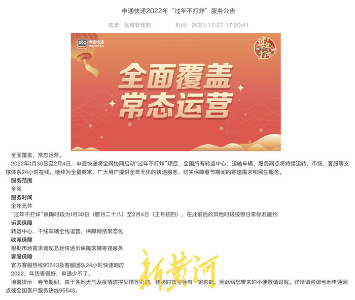 隨后新黃河記者在多家快遞公司的官網(wǎng)查詢后發(fā)現(xiàn),為響應(yīng)春節(jié)期間政府防疫政策號召,滿足春節(jié)期間民眾網(wǎng)購生活的需求,發(fā)揮快遞業(yè)保障民生價(jià)值、體現(xiàn)擔(dān)當(dāng)精神。包括申通快遞、中通快遞、韻達(dá)快遞等多家快遞公司,均在官網(wǎng)發(fā)布公告,宣布啟動“過年不打烊”項(xiàng)目。2022年1月30日(臘月二十八)至2月4日(正月初四)繼續(xù)提供全年無休的快遞服務(wù),其他日期提供常態(tài)快遞服務(wù)。而在不久前,德邦快遞在其公眾號已宣布“春節(jié)不休”。