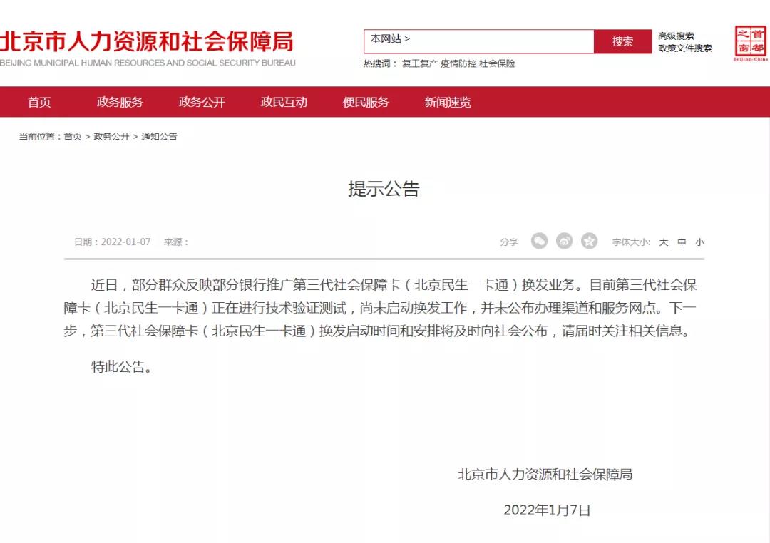 近日,部分群眾反映部分銀行推廣第三代社會(huì)保障卡(北京民生一卡通)換發(fā)業(yè)務(wù)。目前第三代社會(huì)保障卡(北京民生一卡通)正在進(jìn)行技術(shù)驗(yàn)證測(cè)試,尚未啟動(dòng)換發(fā)工作,并未公布辦理渠道和服務(wù)網(wǎng)點(diǎn)。下一步,第三代社會(huì)保障卡(北京民生一卡通)換發(fā)啟動(dòng)時(shí)間和安排將及時(shí)向社會(huì)公布,請(qǐng)屆時(shí)關(guān)注相關(guān)信息。