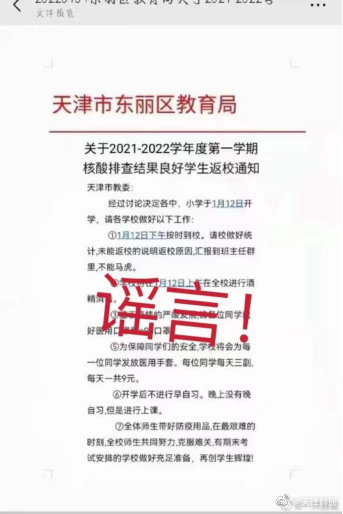 近日,網(wǎng)傳“天津市東麗區(qū)教育局《關(guān)于2021-2022學(xué)年度第一學(xué)期核酸排查結(jié)果良好學(xué)生返校通知》”的截圖引起部分市民的關(guān)注和擔(dān)憂。經(jīng)與我市有關(guān)部門(mén)核實(shí),東麗區(qū)教育局未發(fā)布該通知。