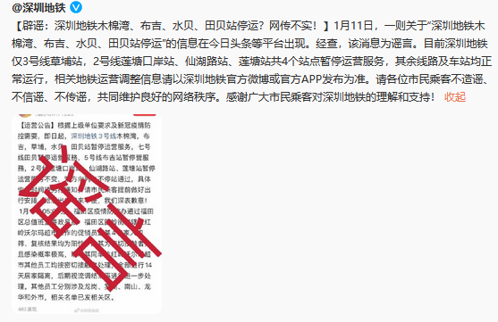 1月11日下午18時,深圳地鐵通過官方渠道發(fā)布辟謠聲明:目前深圳地鐵僅3號線草埔站,2號線蓮塘口岸站、仙湖路站、蓮塘站共4個站點暫停運營服務(wù),其余線路及車站均正常運行。