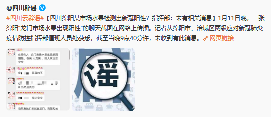 1月11日晚,網(wǎng)傳消息稱“四川綿陽龍門市場水果出現(xiàn)新冠陽性,香蕉,火龍果,請大家注意安全”。經(jīng)核實,以上消息不實!