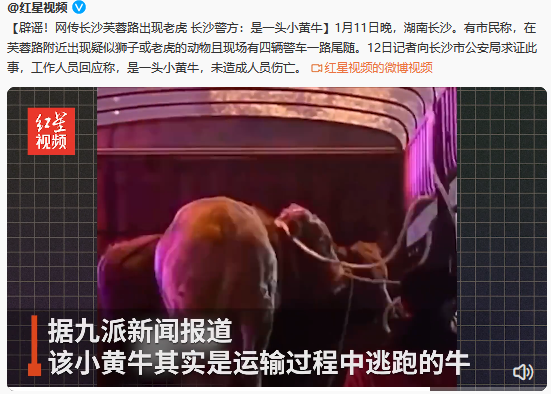 1月11日晚,湖南長沙。有市民稱,在芙蓉路附近出現(xiàn)疑似獅子或老虎的動物且現(xiàn)場有四輛警車一路尾隨。12日記者向長沙市公安局求證此事,工作人員回應(yīng)稱,是一頭小黃牛,未造成人員傷亡。