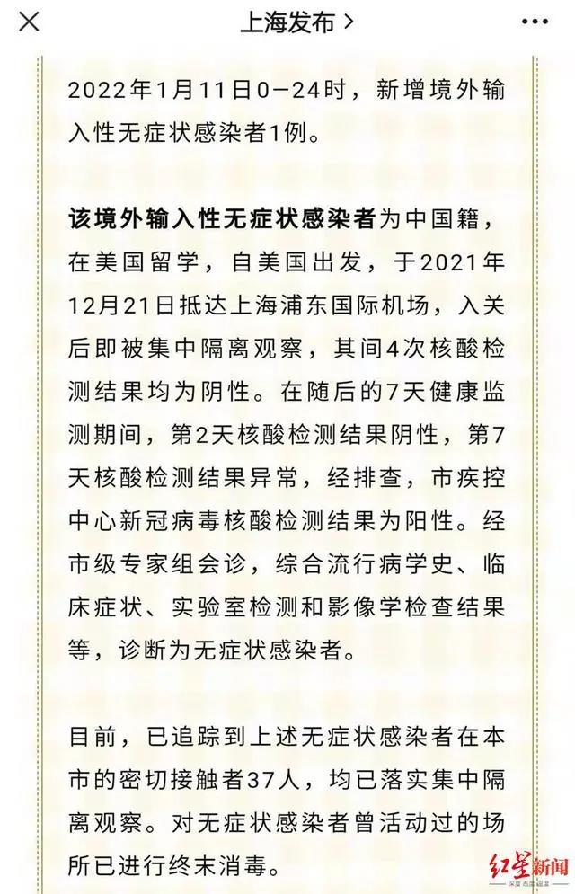 紅星新聞注意到,1月12日,上海發(fā)布官微通報了11日新增1例境外輸入無癥狀感染者。通報稱,2022年1月11日0—24時,新增境外輸入性無癥狀感染者1例。該境外輸入性無癥狀感染者為中國籍,在美國留學(xué),自美國出發(fā),于2021年12月21日抵達上海浦東國際機場,入關(guān)后即被集中隔離觀察,其間4次核酸檢測結(jié)果均為陰性。