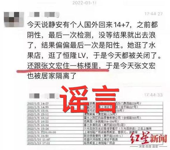 網(wǎng)傳截圖顯示,1月11日17時左右,一網(wǎng)友發(fā)布的微信聊天記錄稱,“今天說靜安有個人國外回來14+7,之前都陰性,最后一次檢測,沒等結(jié)果就出去浪了,結(jié)果偏偏最后一次是陽性。她逛了水果店,逛了恒隆LV,于是今天都被關(guān)閉了。還跟張文宏住一棟樓里,于是今天張文宏也被居家隔離了”。聊天記錄后還附有1月5日至1月10日疑似該確診病例的流調(diào)信息圖片,涉及場所包括倪掌茶舞上海靜安寺店(百樂門黑園路228號)、久光百貨及龍記香港茶餐廳、路易威登上海恒隆廣場店等。