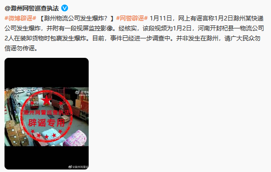 1月11日,網(wǎng)上有謠言稱1月2日滁州某快遞公司發(fā)生爆炸,并附有一段視屏監(jiān)控影像。經(jīng)核實(shí),該段視頻為1月2日,河南開(kāi)封杞縣一物流公司2人在裝卸貨物時(shí)包裹發(fā)生爆炸。目前,事件已經(jīng)進(jìn)一步調(diào)查中。并非發(fā)生在滁州,請(qǐng)廣大民眾勿信謠勿傳謠。 ???