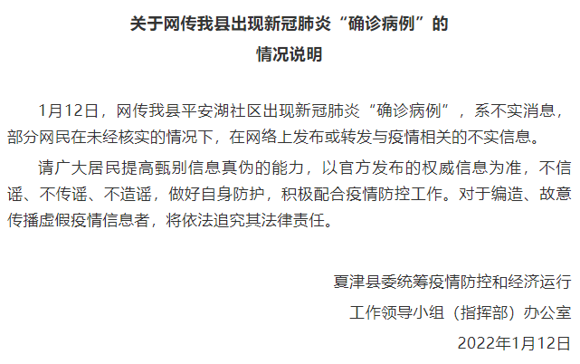 1月12日,夏津縣委統(tǒng)籌疫情防控和經(jīng)濟(jì)運(yùn)行工作領(lǐng)導(dǎo)小組(指揮部)辦公室發(fā)布《關(guān)于網(wǎng)傳夏津縣出現(xiàn)新冠肺炎“確診病例”的情況說(shuō)明》:網(wǎng)傳夏津縣平安湖社區(qū)出現(xiàn)新冠肺炎“確診病例”,系不實(shí)消息,部分網(wǎng)民在未經(jīng)核實(shí)的情況下,在網(wǎng)絡(luò)上發(fā)布或轉(zhuǎn)發(fā)與疫情相關(guān)的不實(shí)信息。