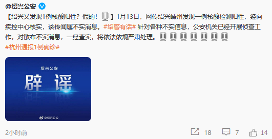 1月13日,網(wǎng)傳紹興嵊州發(fā)現(xiàn)一例核酸檢測陽性,經(jīng)向疾控中心核實(shí),該傳聞屬不實(shí)消息。 針對(duì)各種不實(shí)信息,公安機(jī)關(guān)已經(jīng)開展偵查工作,對(duì)散布不實(shí)消息,一經(jīng)查實(shí),將依法依規(guī)嚴(yán)肅處理。