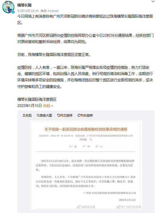 1月15日晚,橫琴長隆官方微博發(fā)布消息,全文如下: