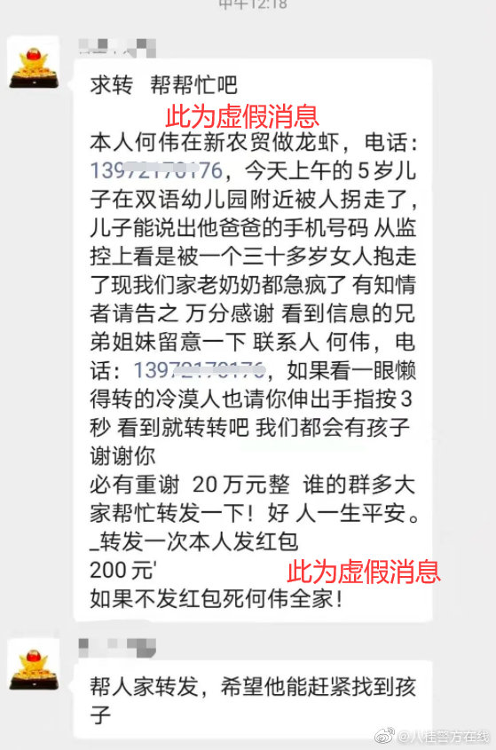 近日,一則“何偉5歲兒子被人拐走”的信息在武鳴的朋友圈、學(xué)生家長(zhǎng)群等傳播,武鳴警方調(diào)查發(fā)現(xiàn),這則所謂“被拐”信息實(shí)為使用老謠言修改編造的,早在數(shù)年以前便已出現(xiàn),且多地警方已經(jīng)為此發(fā)出辟謠通報(bào),證實(shí)確為虛假信息。