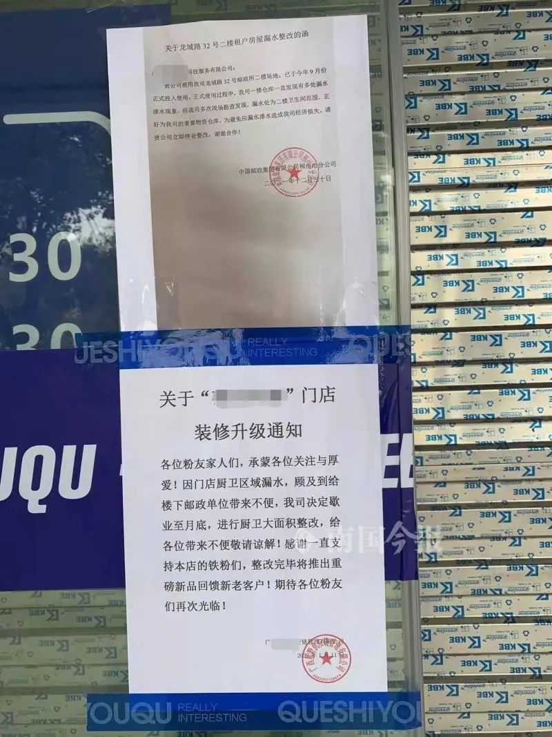該螺螄粉店發(fā)布的裝修升級通知則稱,因門店廚衛(wèi)區(qū)域漏水,估計會給樓下的郵政單位帶來不便,該店決定歇業(yè)至月底,進(jìn)行廚衛(wèi)大面積整改。